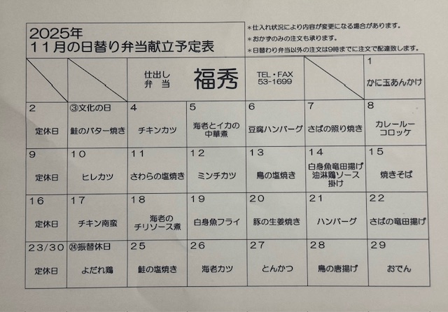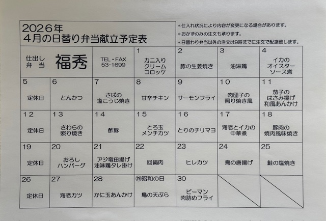 『仕出し弁当 福秀』では、日替り弁当、各種弁当をご用意しています。
